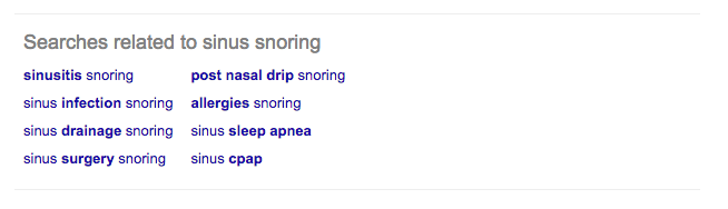 AlthoughSinusSnoringENT.com ranks well for the phrase “Sinus & Snoring Specialists”, they don’t rank too well for other sinus and snoring broad terms without adding “austin” to the search phrase (see related search image below).